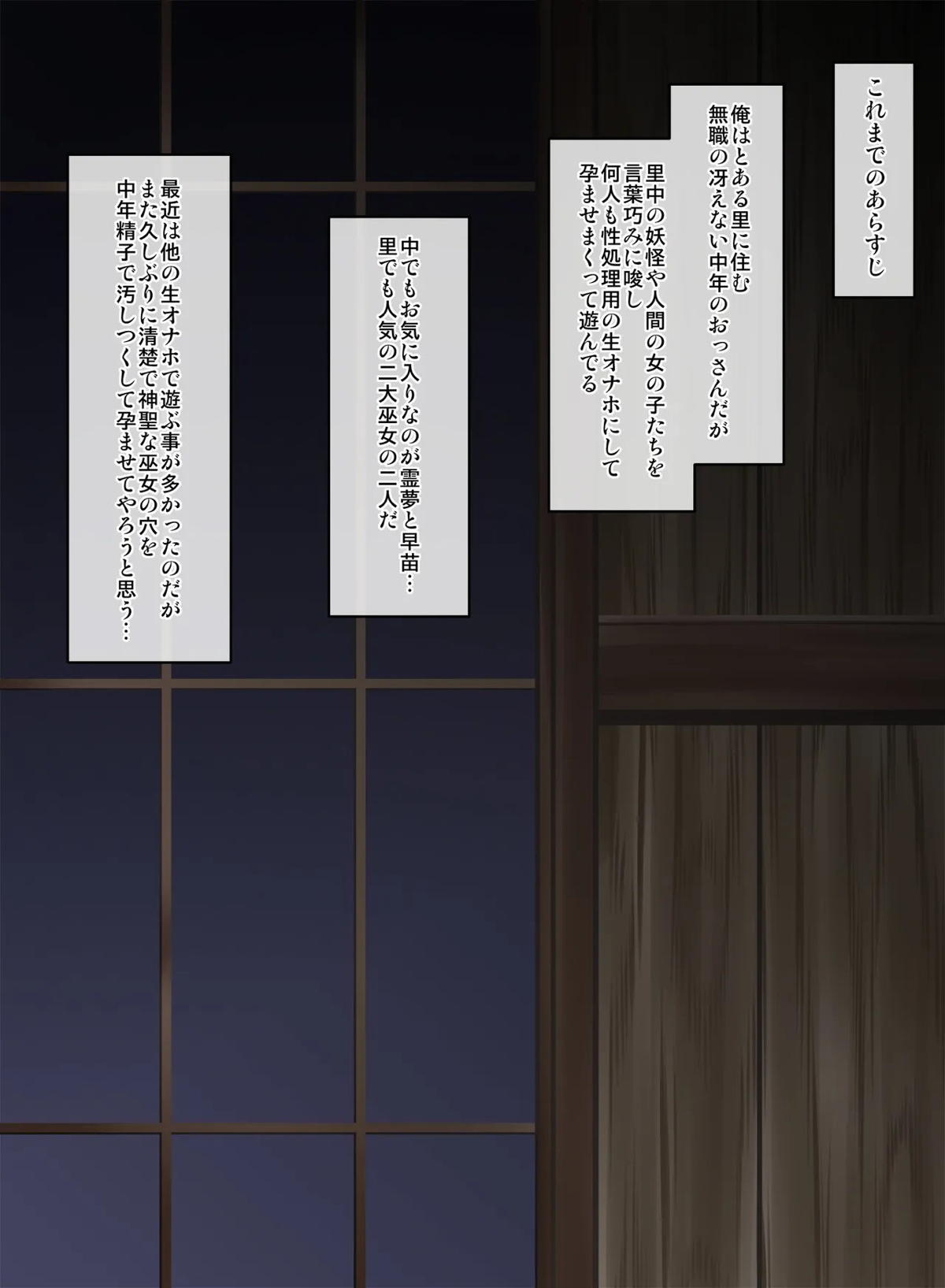 霊夢が絶倫男に種付けプレスや側位でハメられてアヘったり、早苗と一緒にバックや正常位でパコられて孕まされちゃう♡